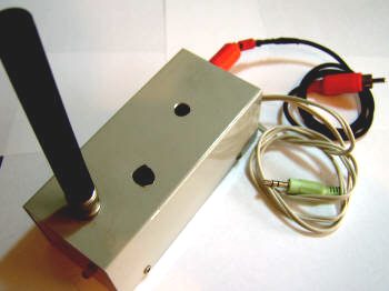 En la imagen se puede ver la caja de la emisora, y asomando por detrás los cables alimentación y de audio (RCA). La antena está aprovechada de un viejo walkie-talkie, pero valdría un simple cable rígido de 10 ó 15 cm. En la parte superior hay dos agujeros, uno para acceder a la resistencia variable que regula el nivel de audio de entrada, y otro para ajustar el núcleo de la bobina de sintonía.