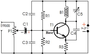 El circuito del esquema es un típico oscilador denominado Colpitts, pero en este caso ligeramente modificado. Como se puede observar, el circuito se alimenta a través de las conexiones marcadas con los signos más (+) y menos (-). La tensión de alimentación es amplísima, pues este aparato puede trabajar con cualquier voltaje entre 9 y 25 voltios (en realidad, yo lo probé hasta con 4,5 voltios y seguía funcionando perfectamente), así que no tendrás problema en encontrar alimentador para él.