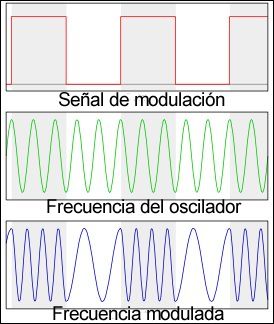 En este gráfico, una señal de modulación cuadrada (por ejemplo unos pitidos emitidos a intervalos), es mezclada con la frecuencia fija del oscilador. La resultante es una variación de la frecuencia acorde con la señal de modulación.